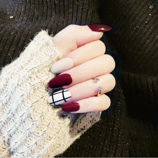 Dark Red White Press On Fake Nails With Black Stripe Designs Shopee Philippines